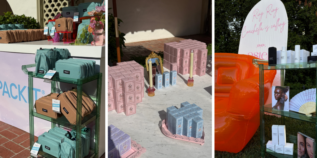 Beyond shopping and gifting, the experience leaned into recovery and prep in a way that mirrors how Coachella insiders approach festival season. Guests could reset with NAD+ IV drips from Tru Niagen, get press-on nails from Glamnetic, and sip on specialty drinks from Angel Margarita, Possmei, and LEVL while grazing on bites from Yooshi Sushi and desserts from The Ice Guys. One of our favorite goodies was a freezable Dual Compartment Snack Box from Pack It, where you can freeze the bag the night before and keep any of your snacks chilled all day long! A live DJ kept the pool area moving, striking the balance between relaxed hangout and low-key day party. A few standout brands anchored the experience, bringing together the perfect mix of fashion, beauty, and festival-ready essentials. Guests gravitated towards those viral  adorable pieces from Pink Palm Puff and Teddy Blake for elevated, wear-now looks, while Dream Pairs delivered desert-friendly footwear that didn’t sacrifice style. On the beauty and wellness side, COLAB, TiZO, and The Good Patch kept guests stocked with essentials designed to survive long days in the sun, while Possmei added a refreshing, social element with drinks in hand as guests moved through the space.