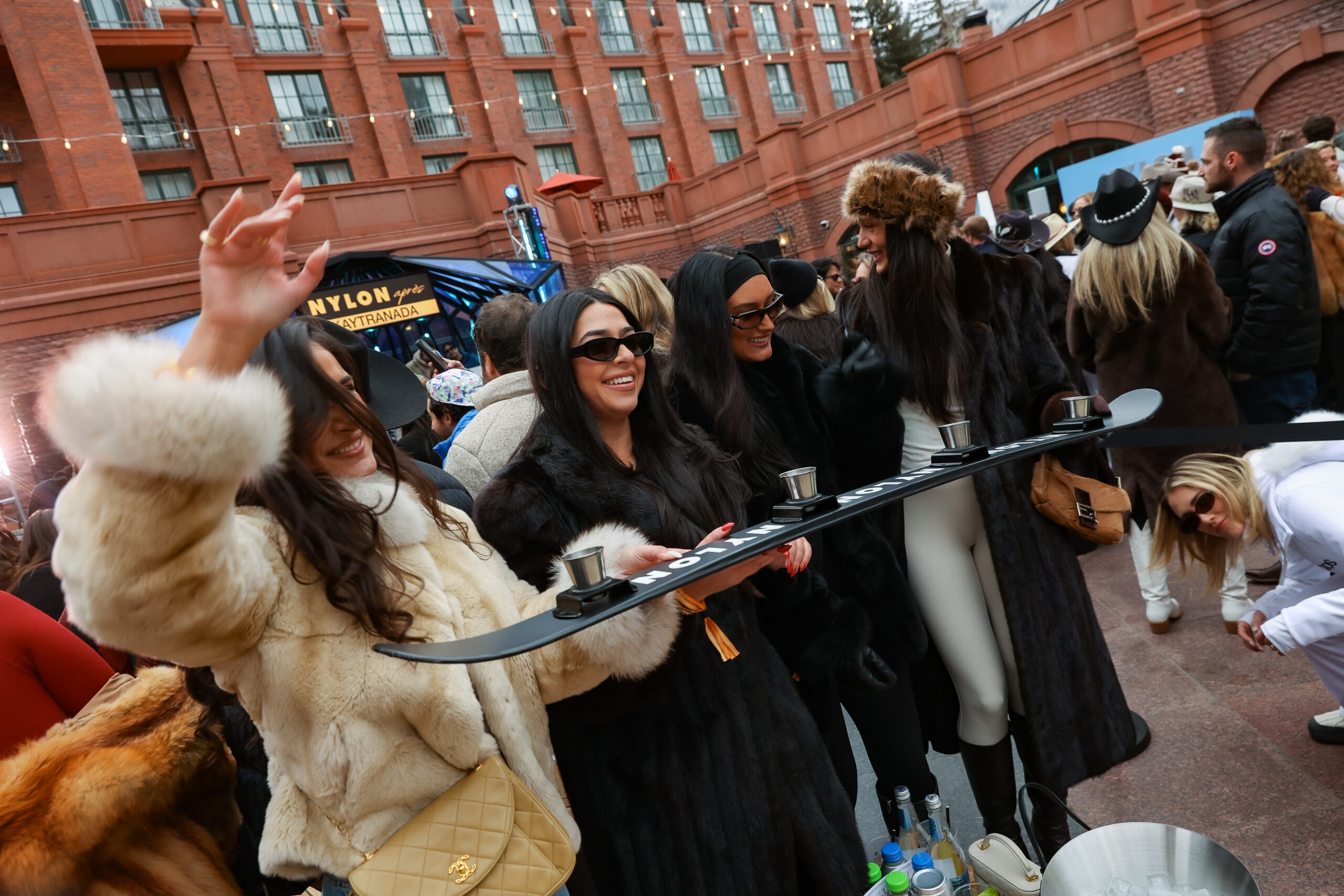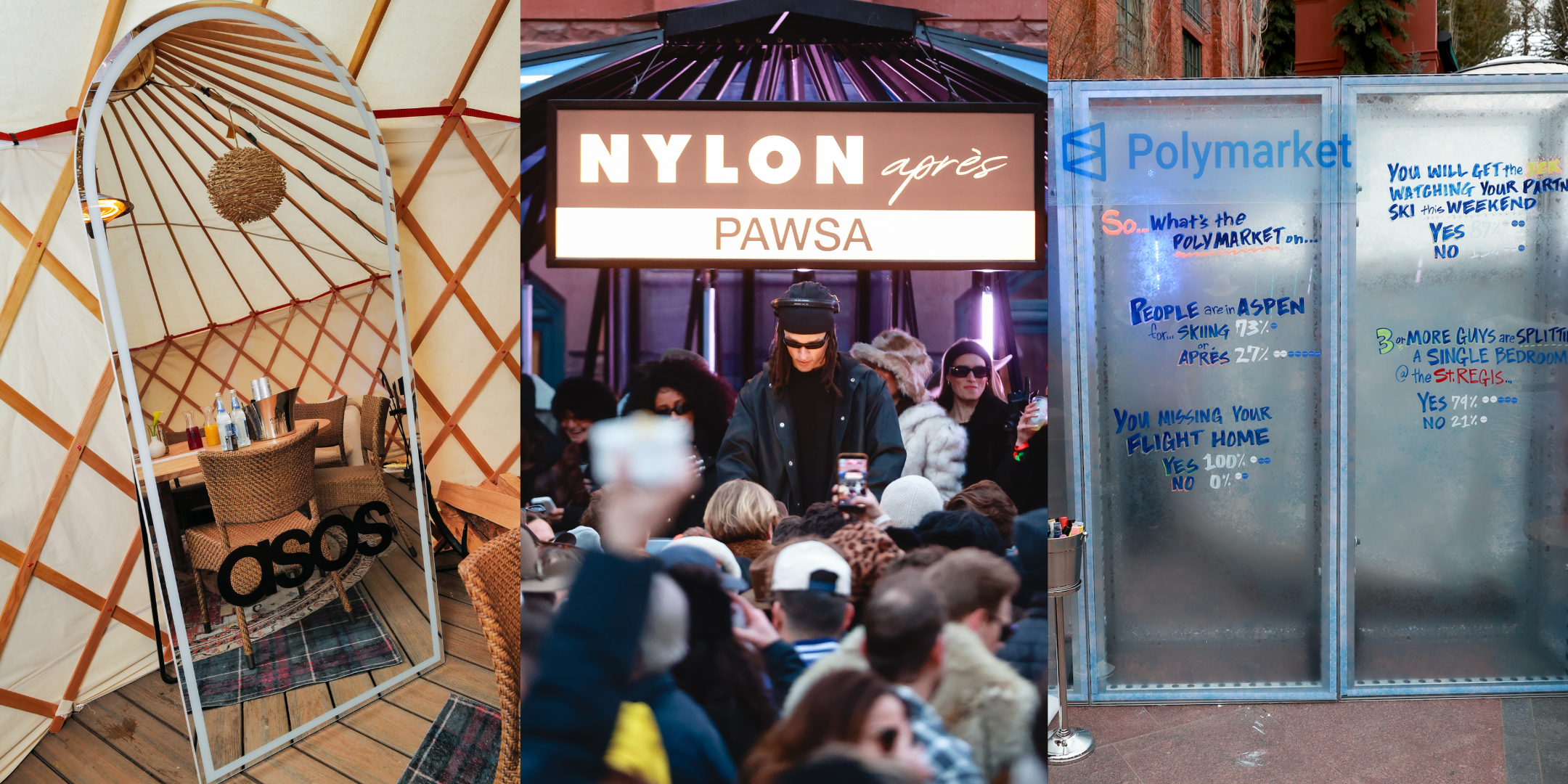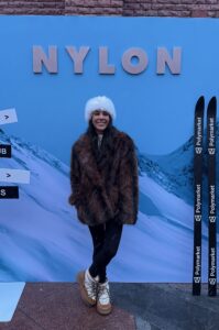 Everything centered around The Snow Lodge’s indoor-outdoor space, where après seamlessly transitioned into late-night energy. The chic mountainside venue set the scene for NYLON’s exclusive winter takeover, where fashion extended beyond the venue itself. Exclusive partner ASOS hosting a curated winter pop-up inside The St. Regis Aspen Resort, showcasing ski sets, statement outerwear, and elevated après looks seen throughout the crowd. Brand moments were woven naturally into the experience. Bloom Nutrition served its Glacier Crush sparkling drink at the energy bar, while Polymarket added an interactive layer with a live prediction mural and Polaroid keepsakes, you’ve probably already seen them on your FYP.