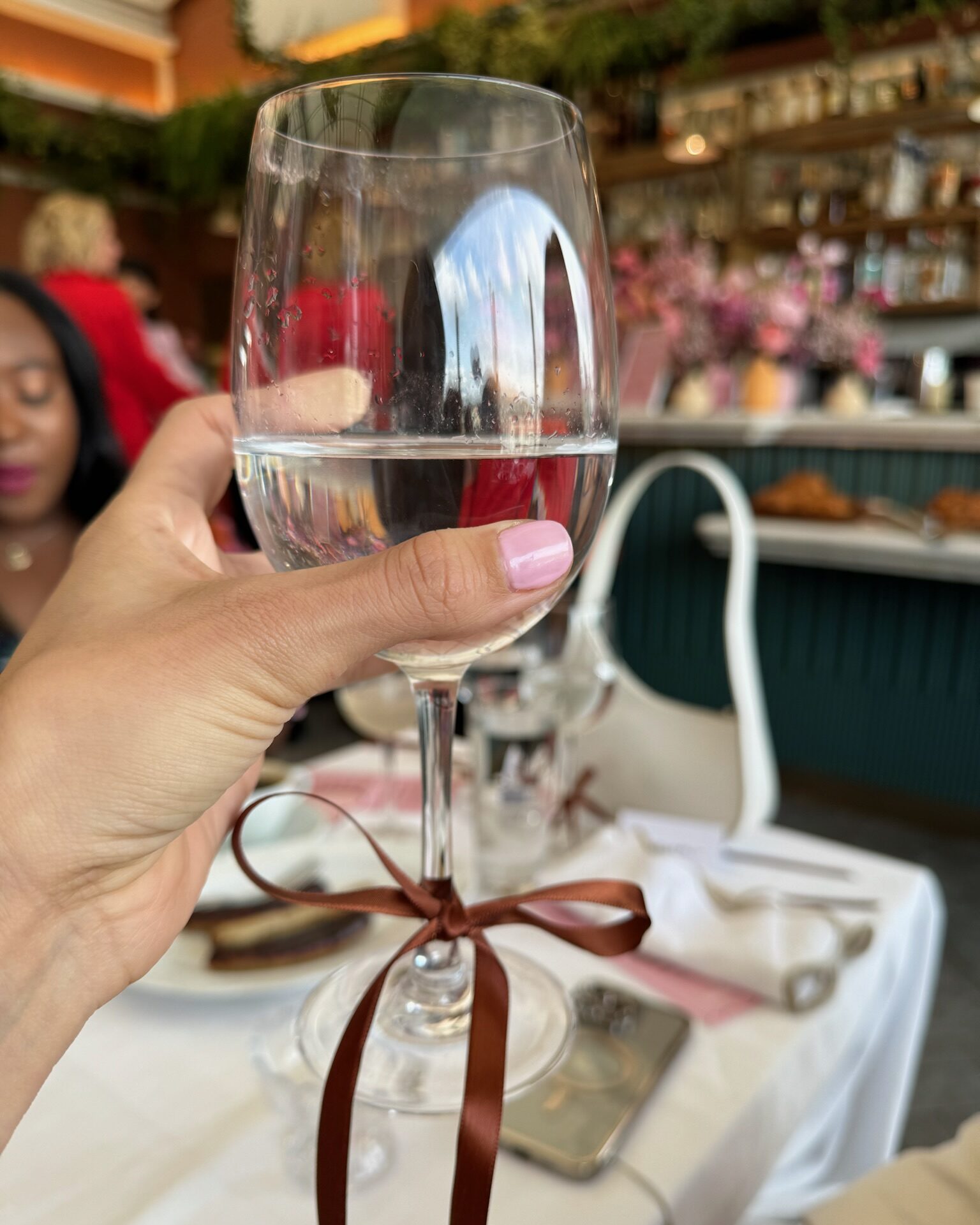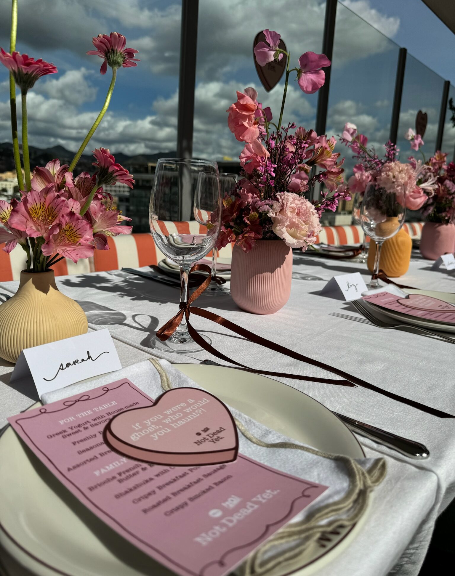 The fun & flirty brunch took place on the rooftop of the Thompson Hotel at Bar Lis in Hollywood. Gorgeous views of the city skyline surrounded the brunch tables which were set with guest names, fancy floral arrangements, wine glasses wrapped in satin bows, and custom menus in the shape of a heart. Brunch was served family style with Brioche French Toast and Parfaits on the list. Of course, coffee and lattes were available (Erika’s favorite!).