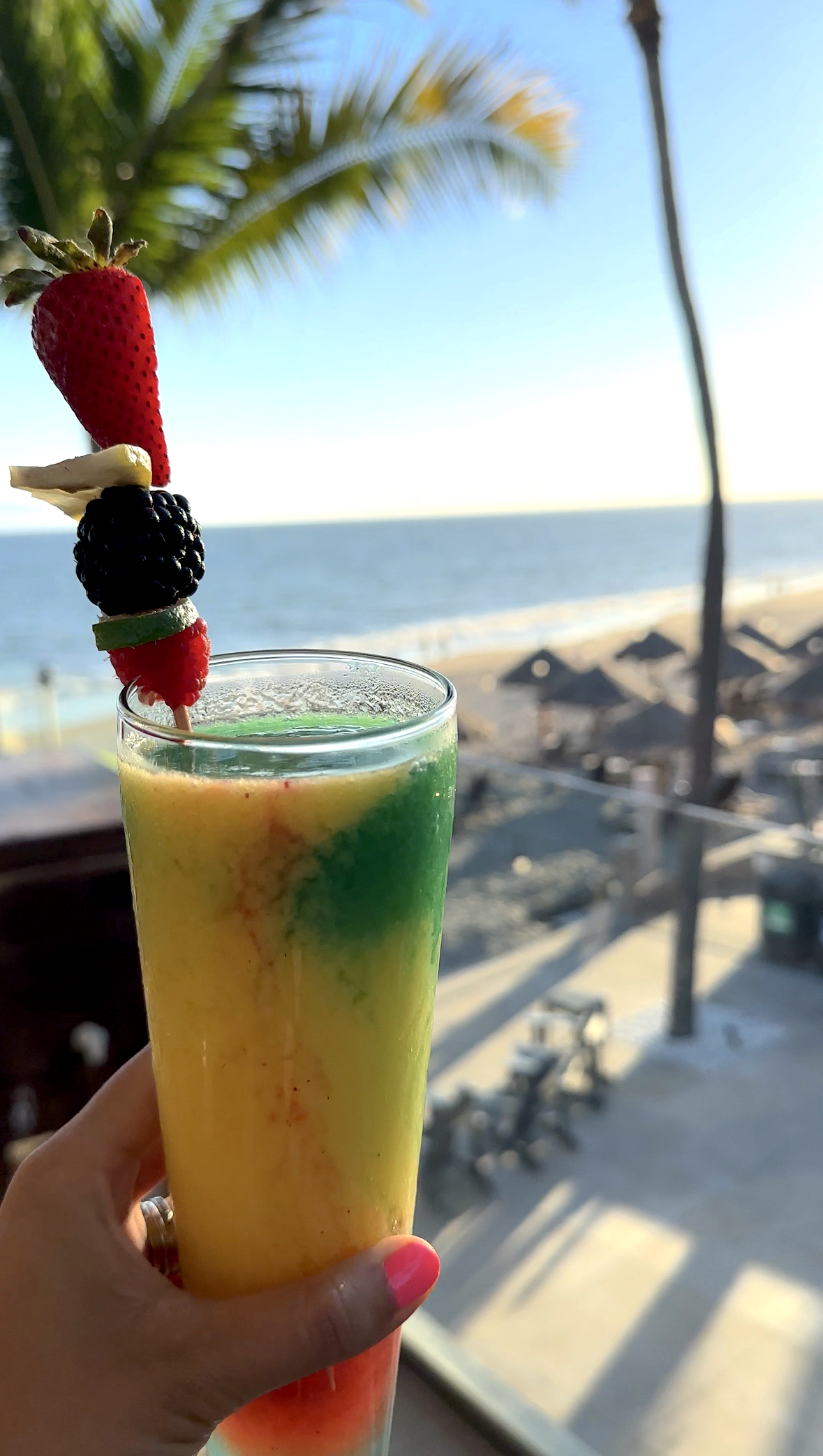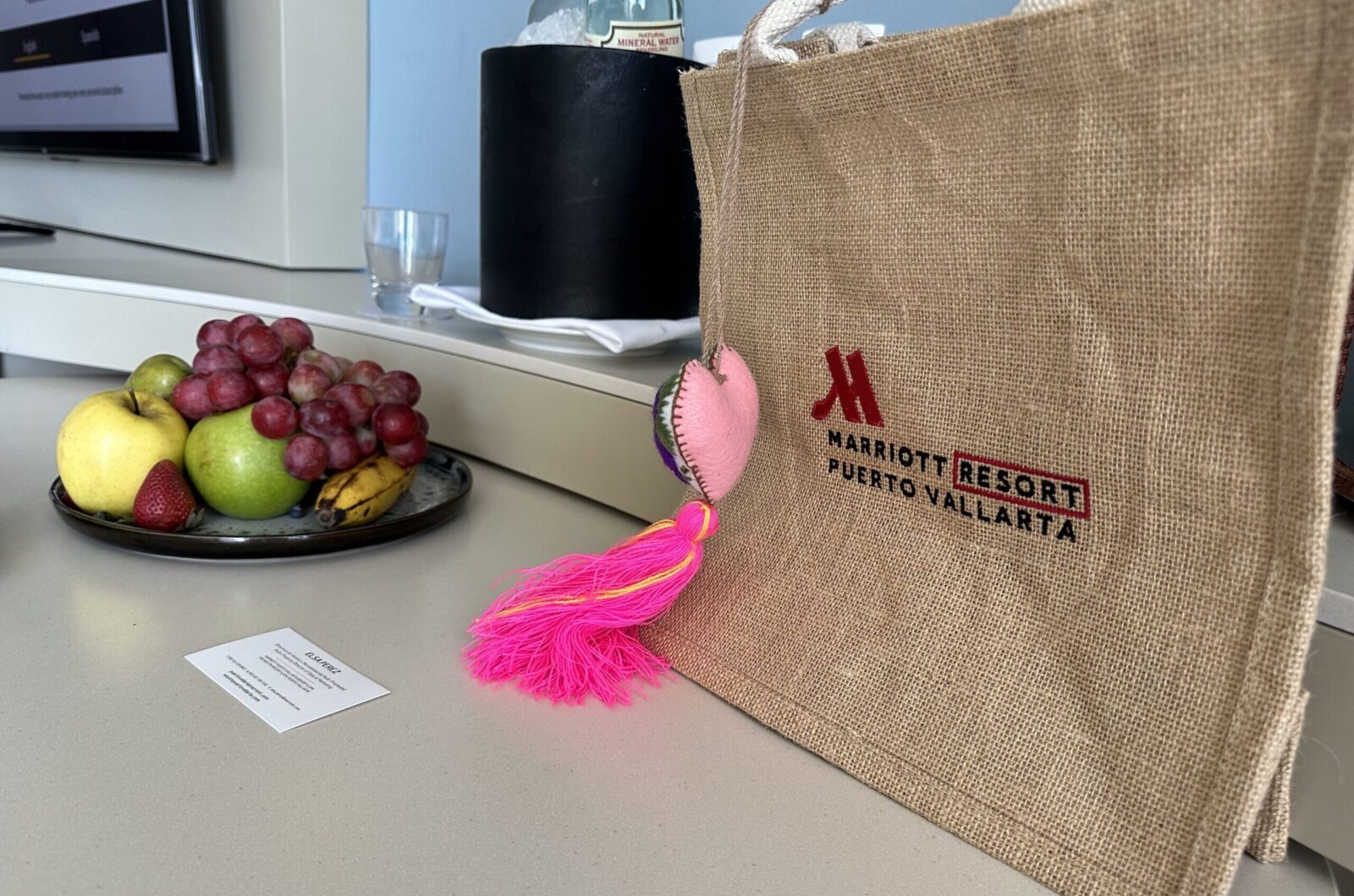 The rooms are bright with a mix of a coastal chic and Spanish vibes. There are elevated amenities like an in-room bar, snacks for purchase, coffee, water, and as a special touch, the staff welcomed our arrival with a fruit tray and local artisan tote. The adorable tassel that hung from it are a classic Puerto Vallarta staple. You’ll find many for sale if you go shopping in the city, but honestly shopping was hardly on our brains. Bring on the sleep (yup, beds were so comfy), coconut cocktails by the beach, and yes the authentic tacos and cuisine Mexico is known for.