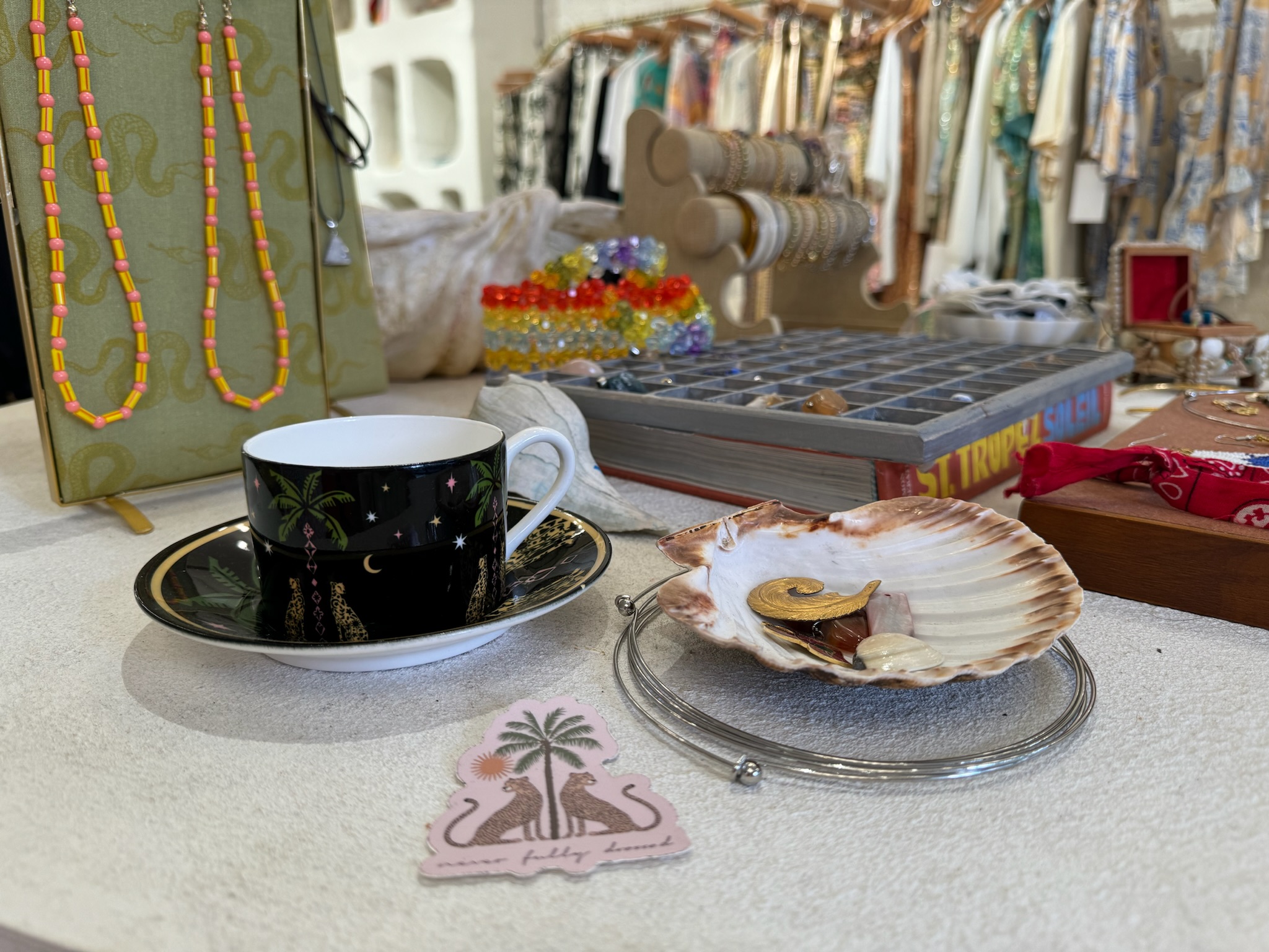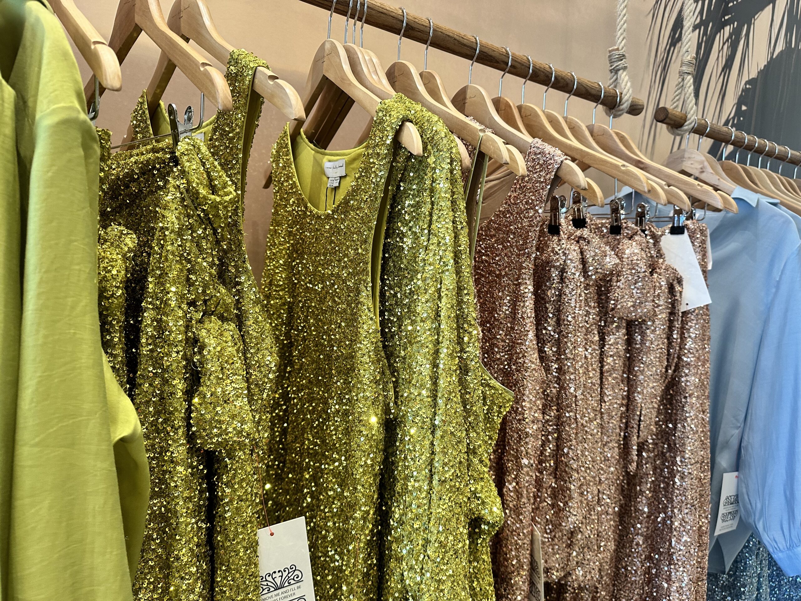 First of all, you can’t miss this shop. Glitzy sequins surround the big windows and when you walk in mixes of rattan, raffia and natural textures are juxtaposed against gorgeous silks, sequins, vibrant palm tree prints, and beaded clutches. If you ask us (and since wedding season is happening right now), Never Fully Dressed is the perfect place to go shopping for a wedding guest fit that will have the bride talking about it tomorrow. “I think our sequins…the best quality sequin you can get. It’s insane. There is a stretch to it, its gorgeous”, says Lucy. But beyond the gorgeous sequined skirts and tops and the anytime of the day dresses, Lucy told us that there are some new pieces that you’ll want to get your hands on. “This year we have new product areas, gym, swim, and nightwear which all surprisingly, they all have done really well.”