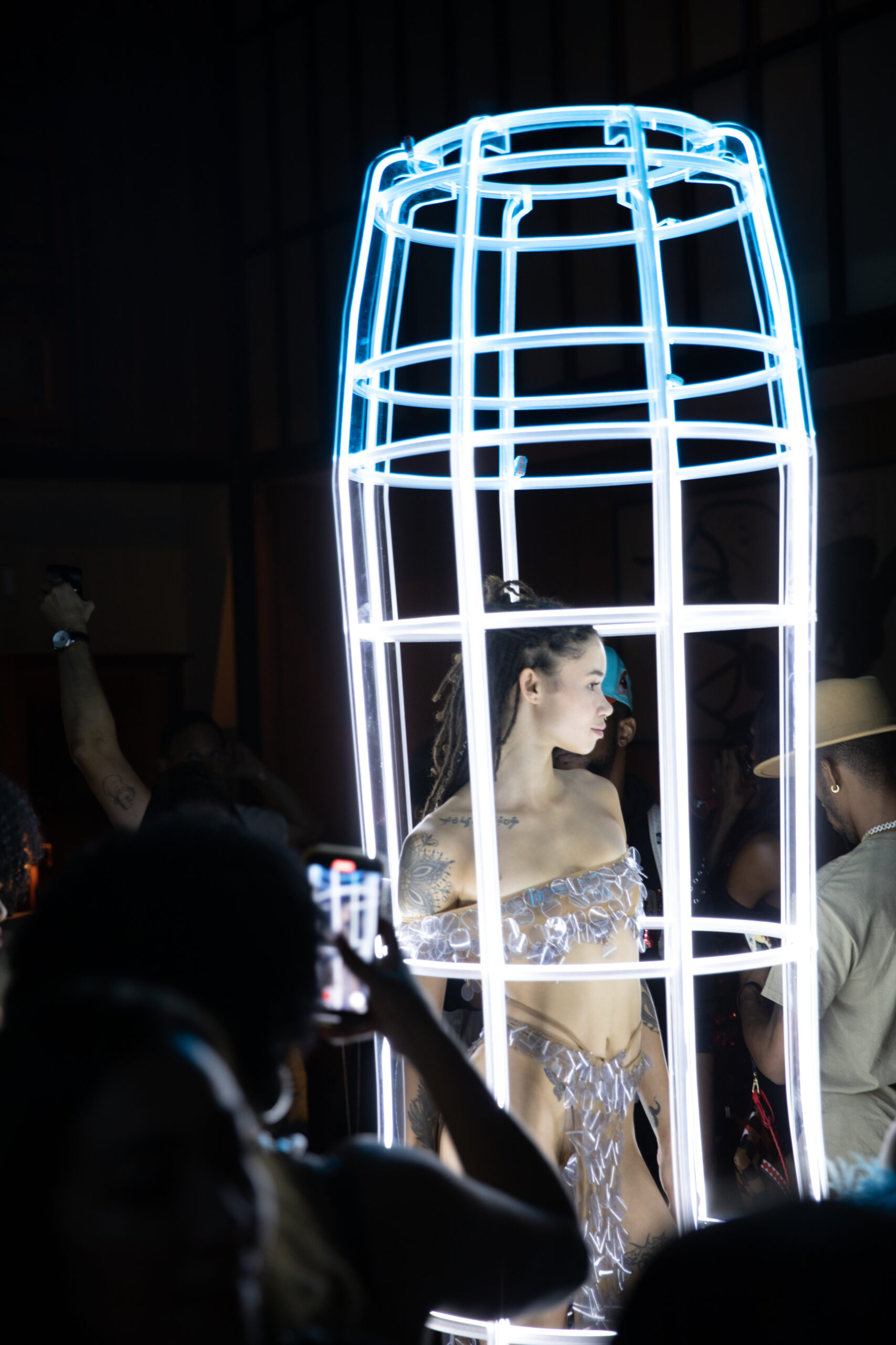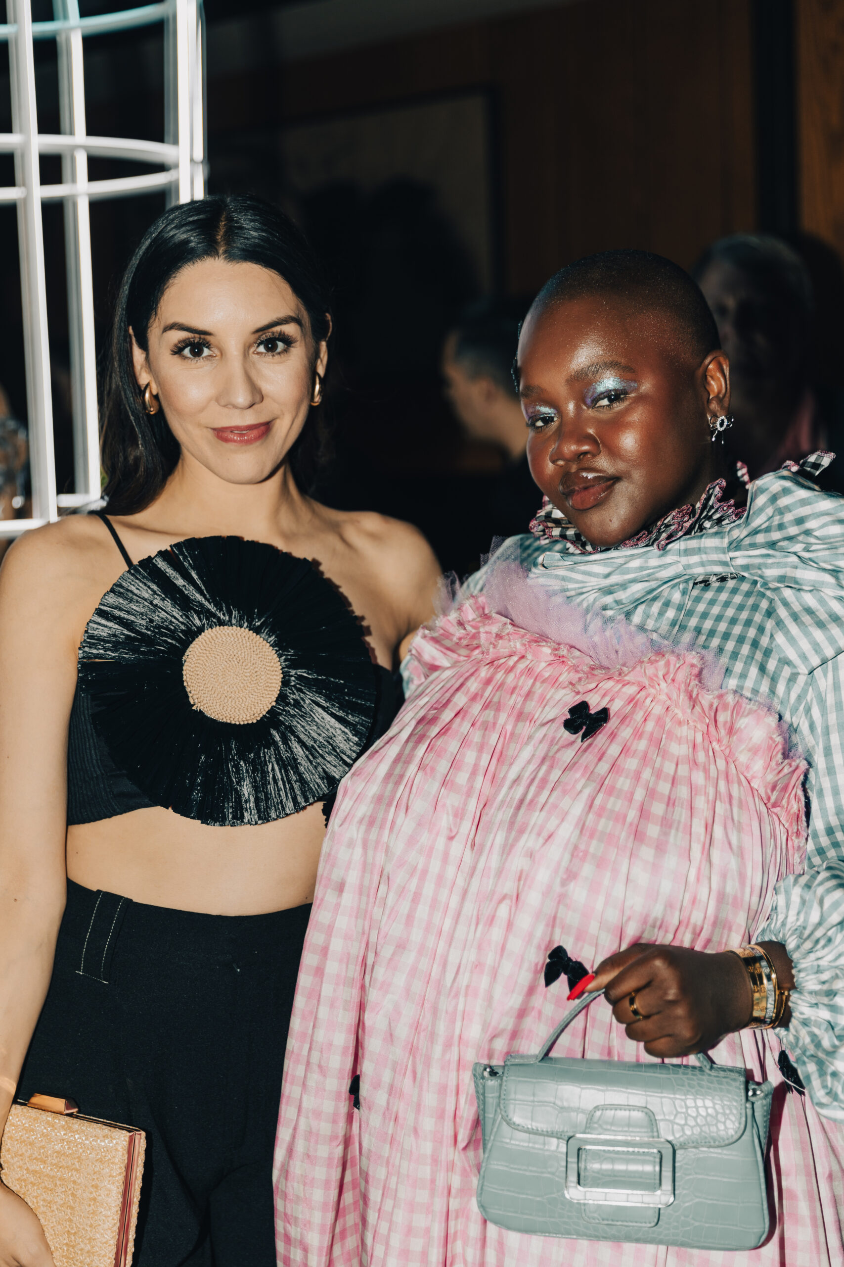 British Born designer Christian Cowan teamed up with Core Hydration’s NYFW partnership for an immersive pop up and cocktail party that featured one of his show stopping pieces ahead of its debut at Paris Fashion Week. Christian’s show in France will actually feature Sam Smith in one of his gowns. But here at NYFW, editors and influencers were treated to a colorful experience with a runway of its own. Basically, there was a set up to record yourself walking the runway. There was also an affirmation wall for people to affirm their wellness journeys and complimentary bottles of Core Hydration water. Then behind a Core Hydration speakeasy door, VIP’s were treated to snacks, a recharge of your phone and hair touch ups by Unite Haircare before hitting up more shows. Then at the cocktail party, guest were able to meet Christian and see his creation illuminated in a Core Hydration like bottle. Erika wore a raffia like bustier top from Zara, trousers and rattan clutch and was able to chat and laugh with model and podcast host Achieng Agutu.