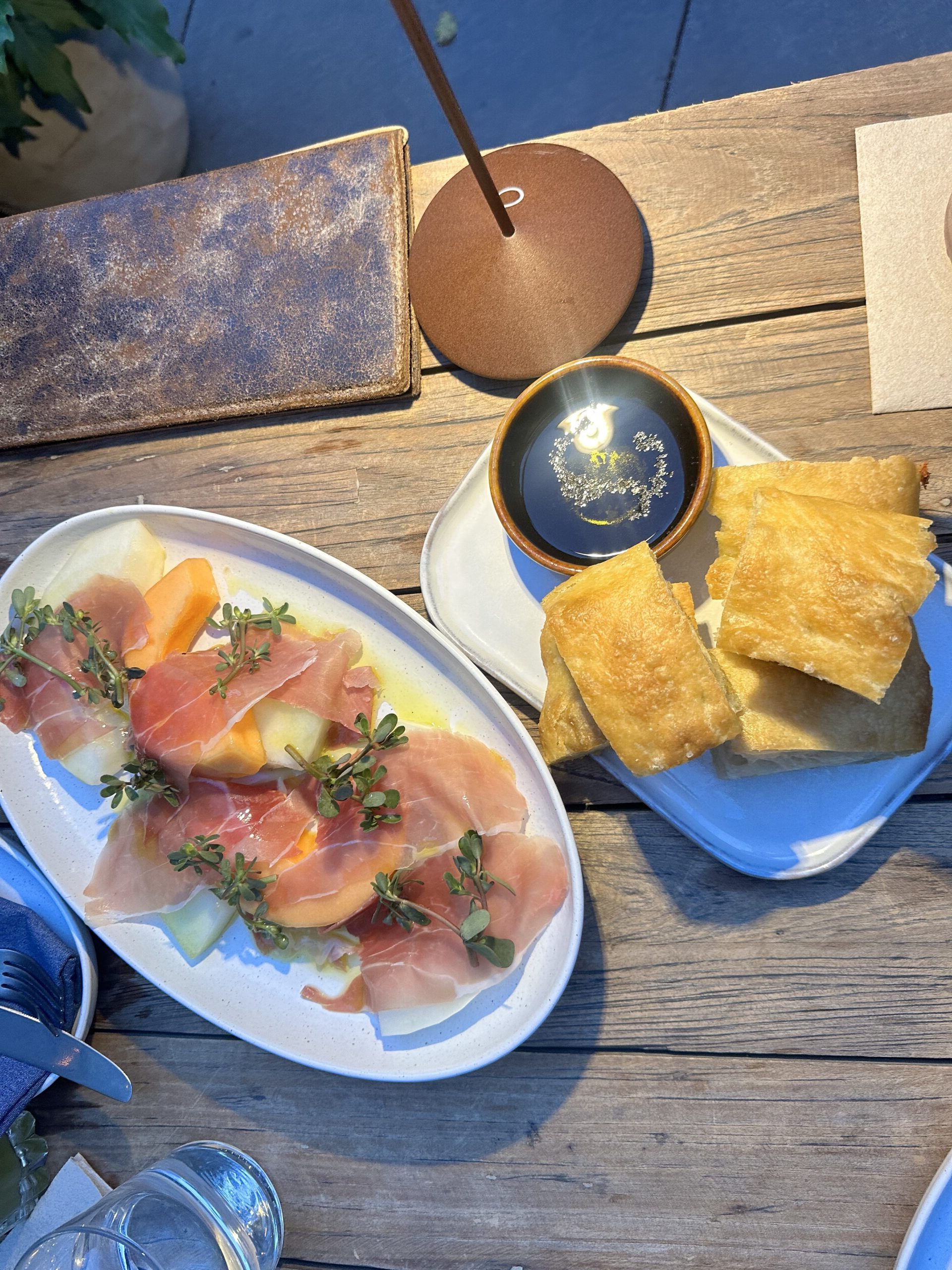 We started with the prosciutto and melon—classic, but done in a way that feels elevated, with perfectly thin slices of prosciutto draped over sweet, ripe melon. Then, we moved on to the bacon-wrapped dates, which come stuffed with creamy, tangy Laura Chenel goat cheese. The star of the show were the smoked lamb ribs: tender, juicy, and bursting with flavor. These were served with waffle fries and fresh herbs from the garden, which added a surprising brightness to the dish. We barely had room for the gooey perfect cocoa brownies topped with fresh berries, but somehow were able to miraculously gather the strength to eat quite a few. We paired it all with one of their signature botanical cocktails, the Hollywood Hibiscus Spritz, featuring notes of bright tangerine and fresh club soda, plus an espresso martini, of course, and sipped and savored the moment while under twinkly lights and surrounded by beautiful greenery.