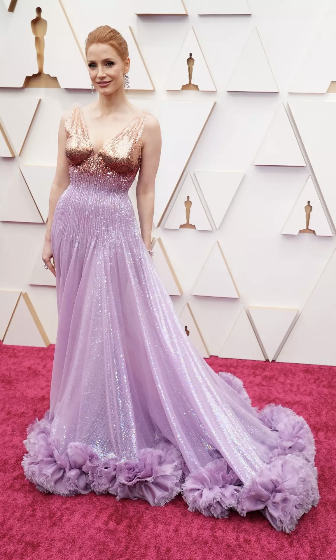 First time Oscar winner Jessica Chastain was absolutely mesmerizing in a (quite literally) glowing Gucci gown. Zendaya followed looking runway ready, wearing a menswear cropped shirt and sparkling skirt by Valentino & Finally, Timothée Chalamet showed UP, wearing a cropped sequined womenswear Louis Vuitton blazer, complimented by some stunning Cartier jewelry.