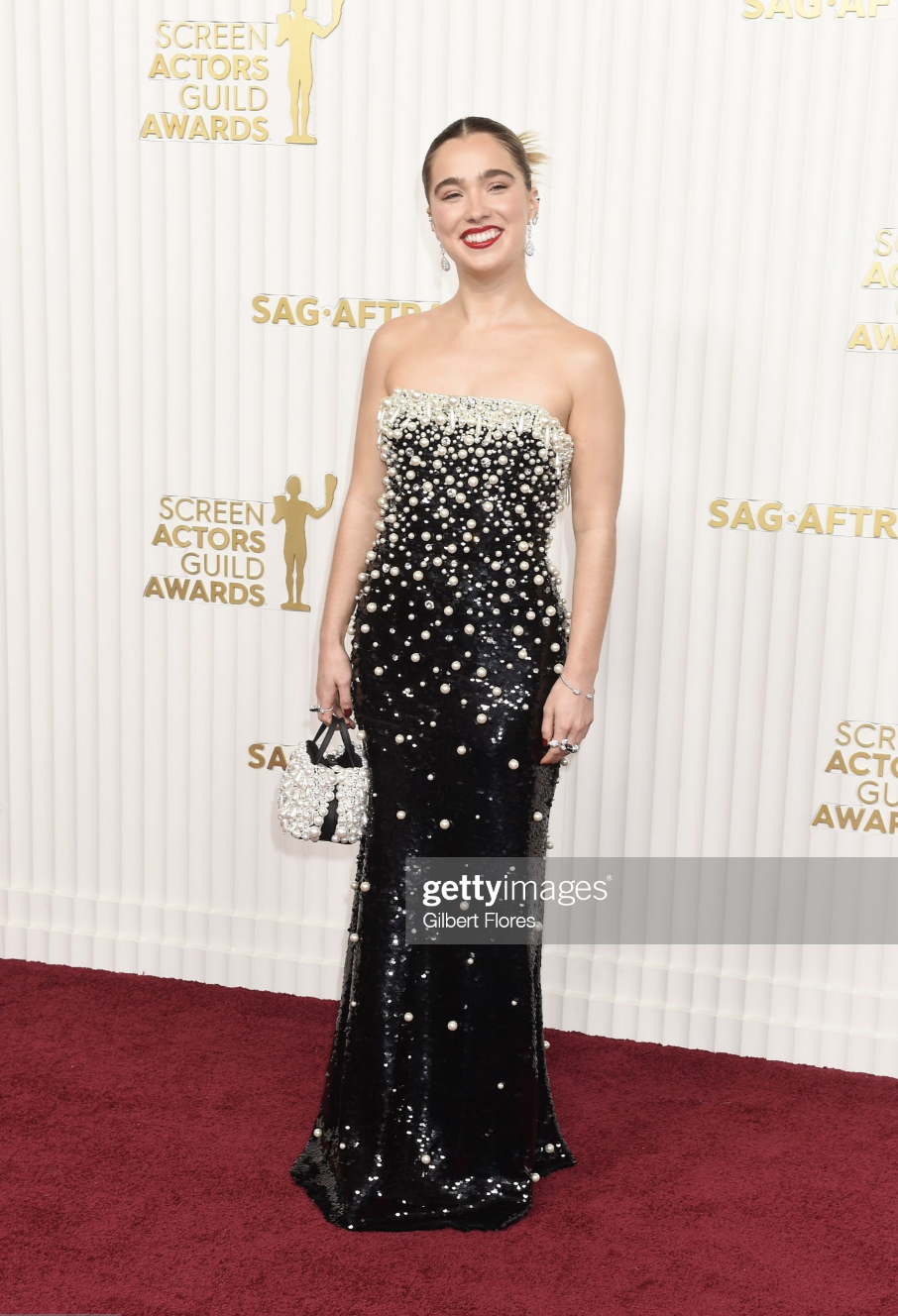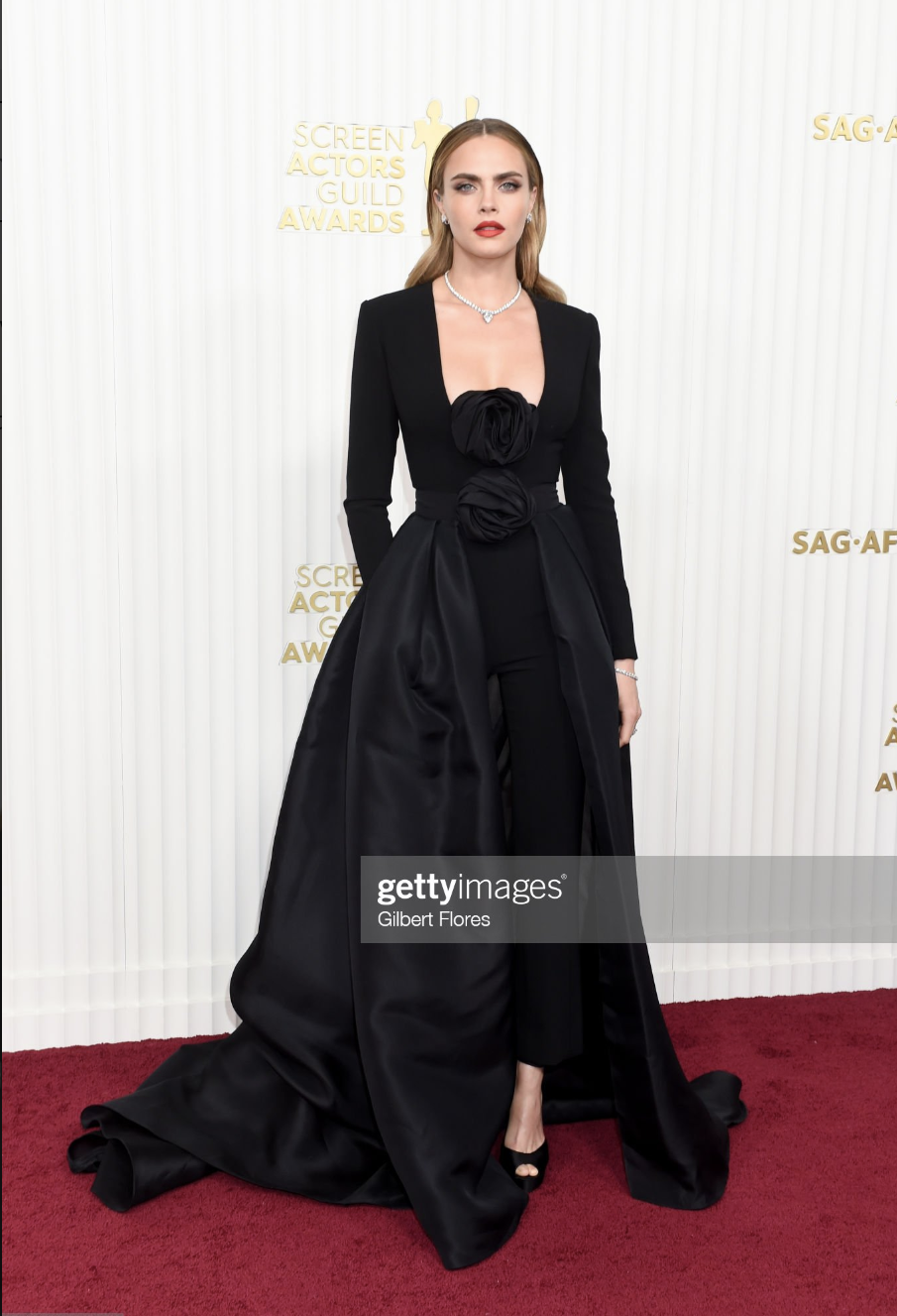 When it comes to pulling off a red carpet look, it’s all in the details. Julia Garner, whose character Ruth from Ozark is far from wearing couture in the show, made a fiery and luxe fashion statement in Gucci. We loved the dress’s siren vibes with a seashell bustier and sparkling fish net top. The White Lotus’s young breakout starlet – Haley Lu Richardson – made a glamorous splash in a pearl encrusted Carolina Herrera dress that dripped from top to bottom in a sea of gems. Cara Delevingne totally pushed red carpet limits with her black Carolina Herrera jumpsuit. And this wasn’t just any jumpsuit. Her red carpet look was stylish with a deep neckline, rosette details, gathered skirt, and long sleeves.