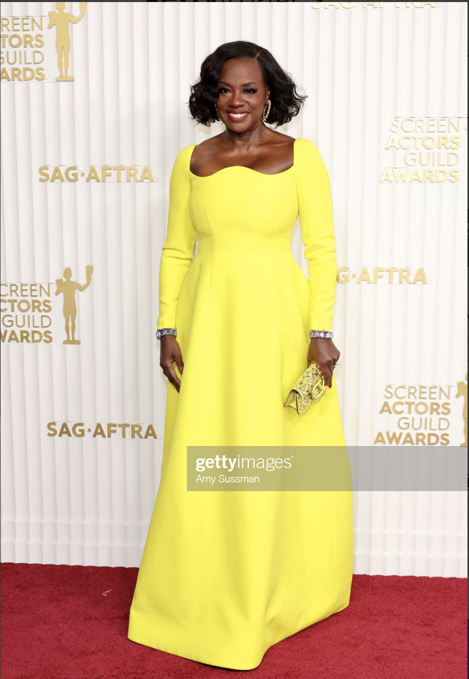 After LA’s long rainy weekend, it was especially bright to see Wakanda Forever’s Queen, Anglea Bassett, in sunny yellow tulle from Giambattista Valli Couture. The Crown’s Claire Foy showed off a regal look in a plunging Prada gown. And Viola Davis was a ray of radiant sunshine in a floor length Valentino dress and matching clutch.