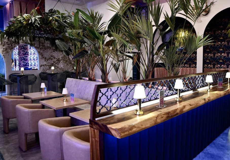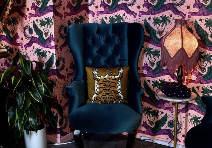 Let’s start off with the remarkable decor! Picture the living room of a family member who collects the finest antiques, loves unique color combinations, and somehow it all works together. Jewel-toned leopard wallpaper, jaguar figurines, kitschy lamps, and framed pictures of goats. It has so many post-worthy corners and crevices, including the well-lit and retro modern bathroom that would be perfect for your “Night Out” story post. It’s super fun and modern, yet has a touch of Palm Springs meets Hollywood Regency atmosphere. Much like the Tom’s themselves, there’s a touch of humor mixed with professionalism and pristine taste in the space. The lighting is moody, with large elegant fixtures above the booth seating. Be sure to snap some pics with their bright neon to elevate your selfie game.